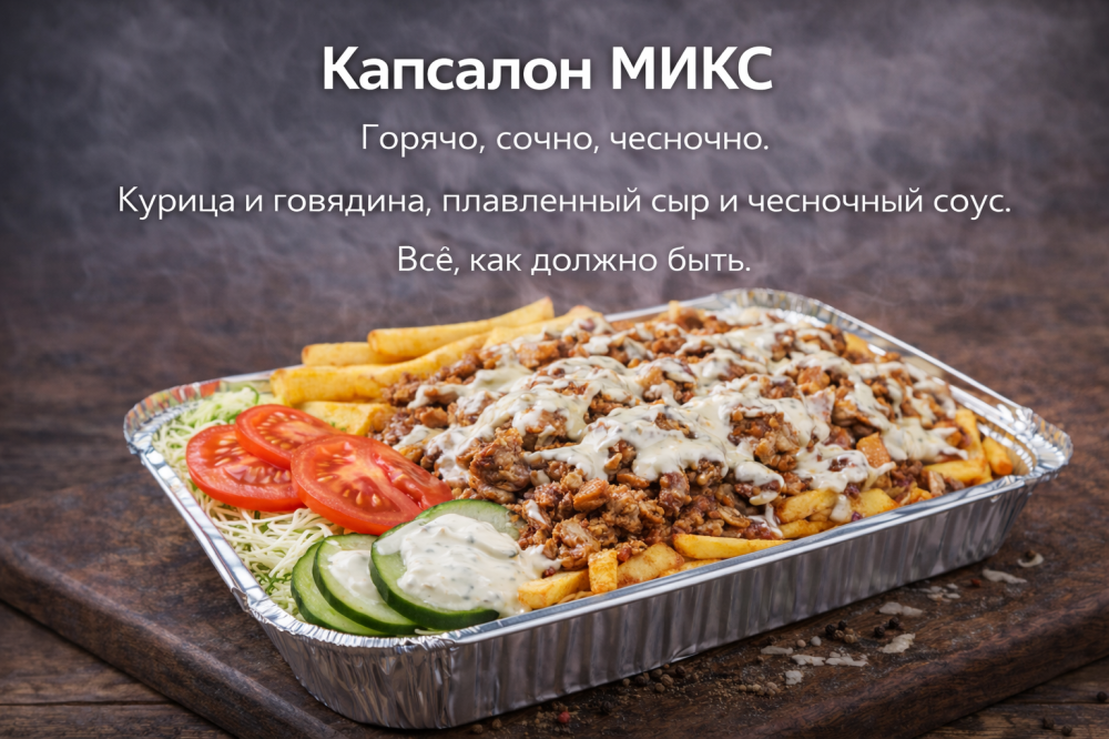 Золотистый картофель фри на самом дне, расплавленный сыр "Моцарелла", невероятное комбо курицы с говядиной, фирменный чесночный соус, свежие овощи и финальный штрих — ещё немного соуса сверху. Горячо, сочно, чесночно — всё, как должно быть.
